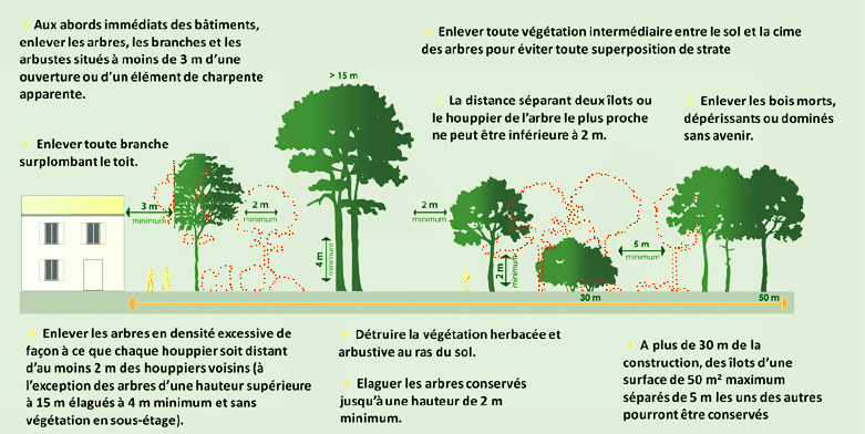 Ces opérations assurent une rupture suffisante de la continuité du couvert végétal. Elles peuvent comprendre l’élagage des sujets maintenus et l’élimination des rémanents de coupes.